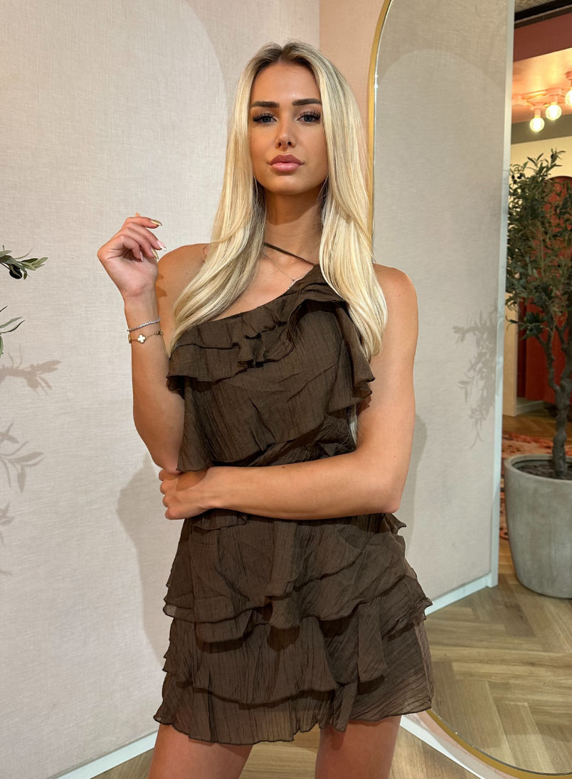 De Aimee Dress is beschikbaar in drie kleuren, zwart, bruin en wit en past perfect bij zowel een zomerse look met slippers als een partylook met hoge laarzen. De one shoulder-achtige halslijn met striksluiting in de nek geeft een verfijnde en trendy touch.