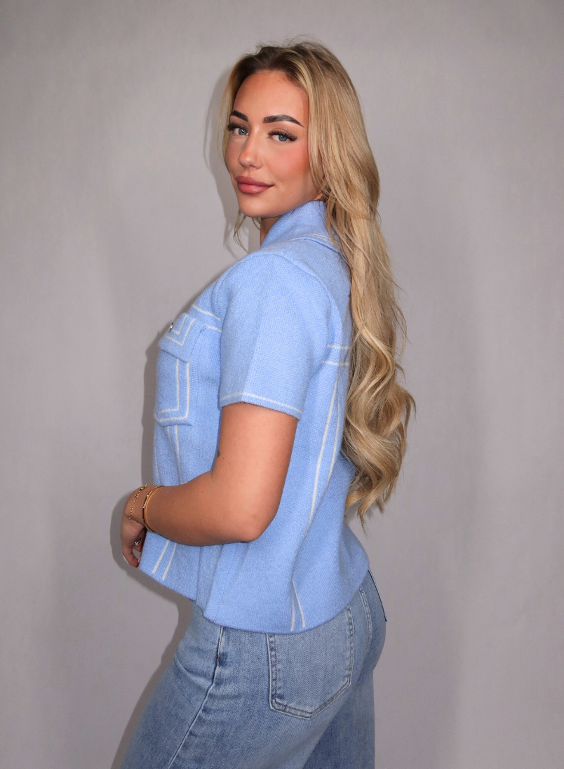 De Becca top is een stijlvolle knit top met korte mouwen en een klassieke kraag. Het model heeft een rechte, licht boxy pasvorm en sluit aan de voorzijde met knoopjes. De gebreide stof voelt stevig maar comfortabel aan en geeft de top een luxe uitstraling. De lichtblauwe kleur wordt gecombineerd met subtiele contrasterende belijning en twee borstzakken met klep en knoopdetail, wat zorgt voor een speelse maar nette look. Perfect te dragen als top of licht vestje, gecombineerd met een jeans of pantalon.