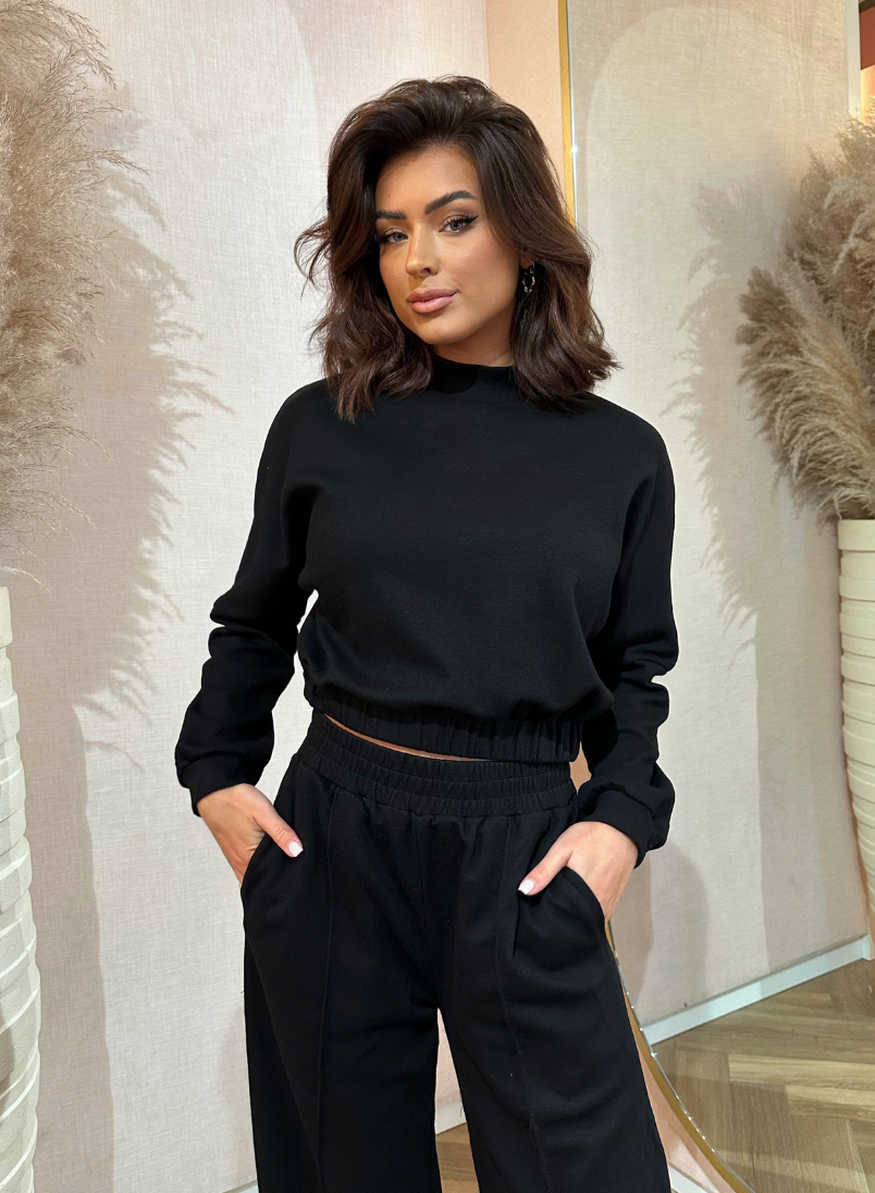 De Bibi Set bestaat uit een cropped sweater en een wide leg broek met twee steekzakken. Beide items bevatten stretch.