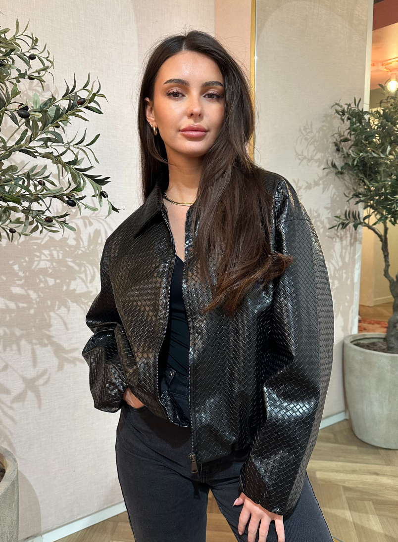 De Bodhi Jacket – Black is dé statement jas van dit seizoen. Deze faux leather jas heeft een opvallende geweven structuur die zorgt voor een luxe uitstraling. De bomber fit en ritssluiting aan de voorkant geven het item een stoere, maar toch vrouwelijke look. Perfect te combineren met jeans voor een casual vibe, of over een jurk voor een edgy touch. Een absolute musthave voor jouw fall/winter garderobe.