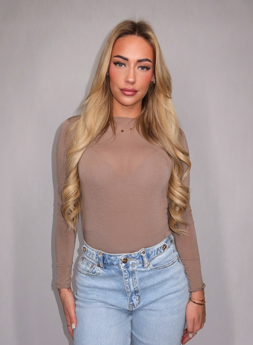 Deze taupe cashmere top is een zachte en verfijnde basic die makkelijk te combineren is. De top heeft een aansluitende pasvorm met een elegante boothals en lange mouwen, wat zorgt voor een vrouwelijke en minimalistische uitstraling. De dunne, soepele stof voelt comfortabel aan op de huid en valt mooi langs het lichaam, waardoor de top zowel casual als iets netter te stylen is.