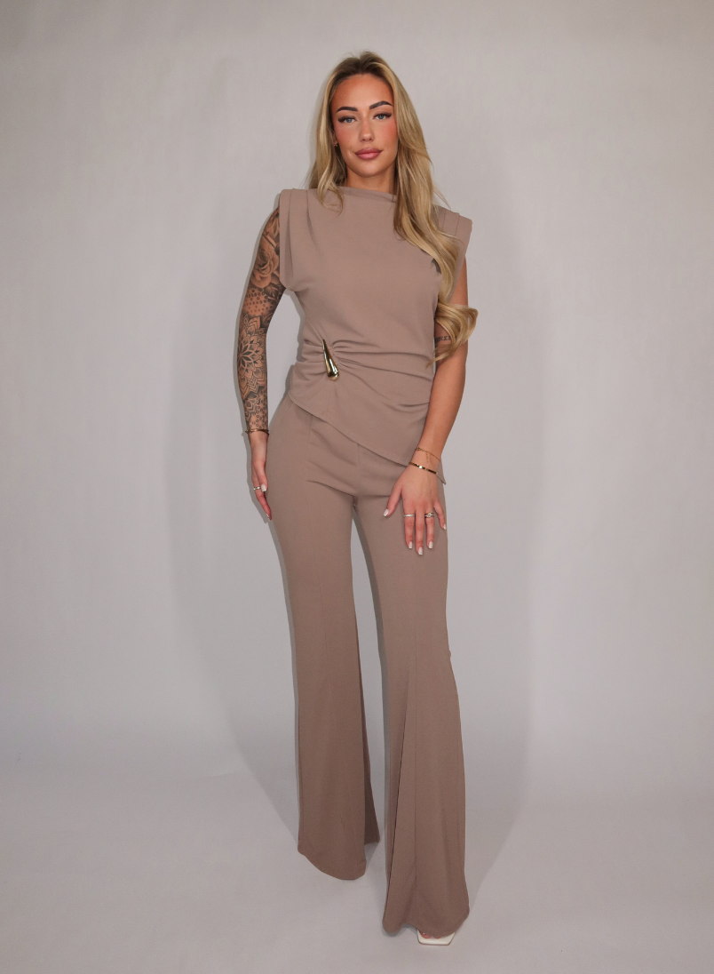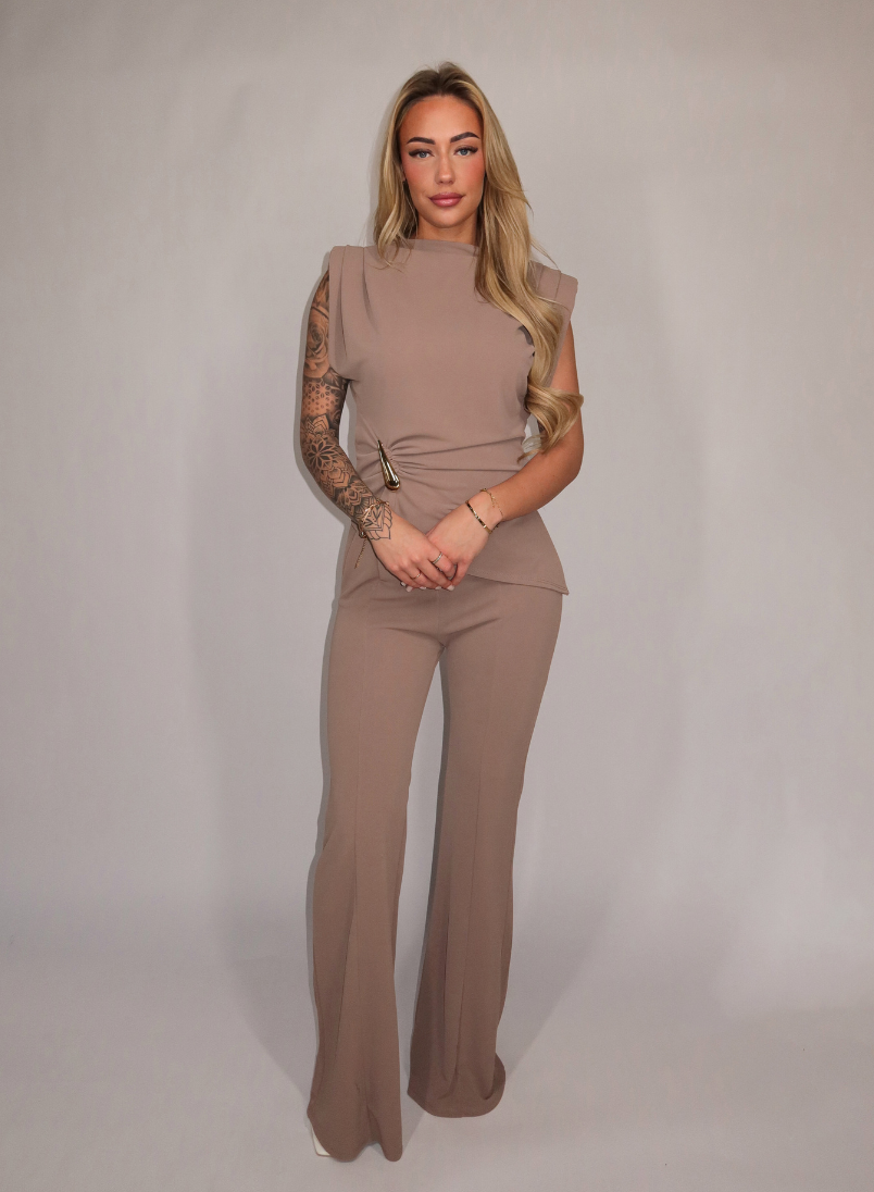 De Danique set in taupe is een stijlvolle en comfortabele two-piece met een elegante uitstraling. De top heeft een losse, soepel vallende pasvorm met een zachte watervalhals en een gedrapeerd detail aan de zijkant dat wordt afgewerkt met een subtiel goudkleurig accent. De bijpassende broek valt recht langs het been en zorgt voor een relaxed maar verzorgde look. De stevige, licht gestructureerde stof draagt comfortabel en geeft de set een mooie vorm.