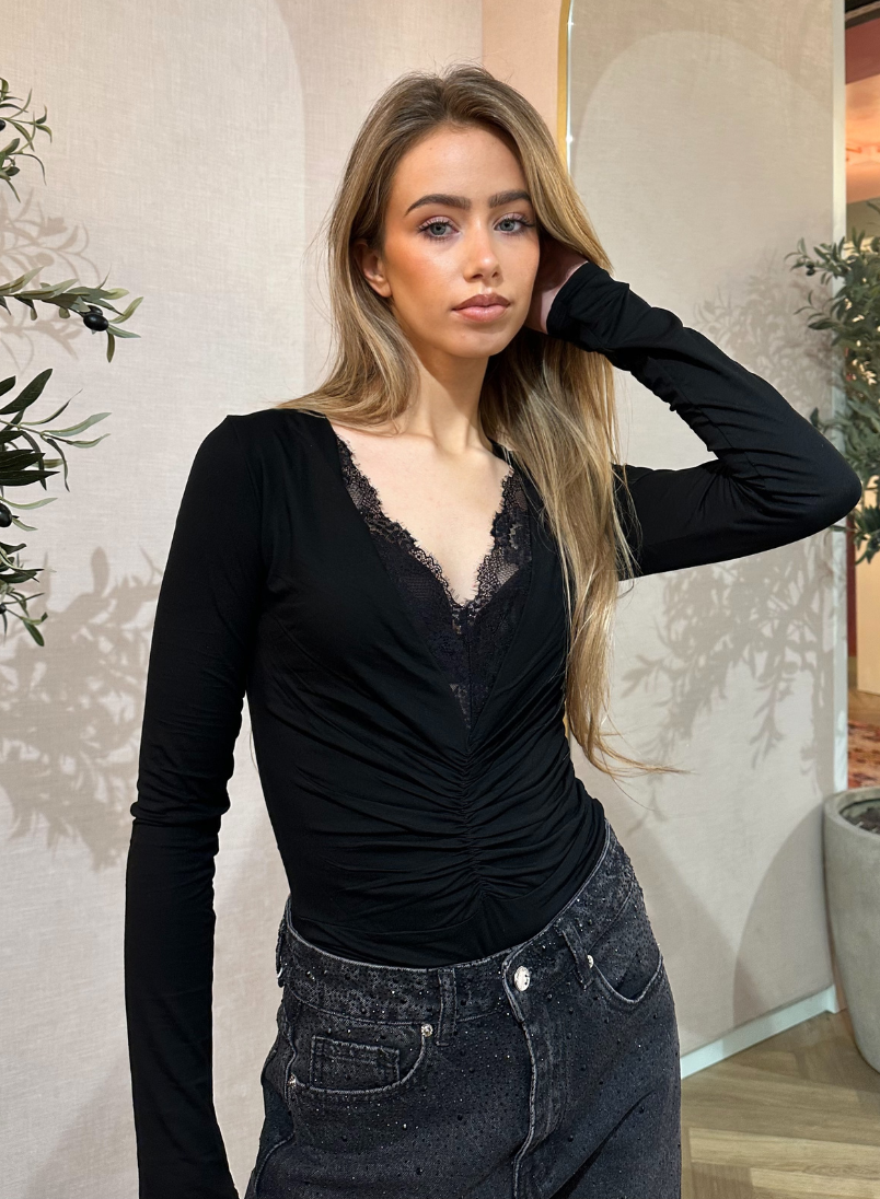 De Imran Body is een aangesloten longsleeve body met diepe V-hals en kanten inzet. De plooidetail aan de voorzijde accentueert de taille op een flatterende manier. Dankzij de zachte stretchstof biedt deze body comfort en een perfecte pasvorm.