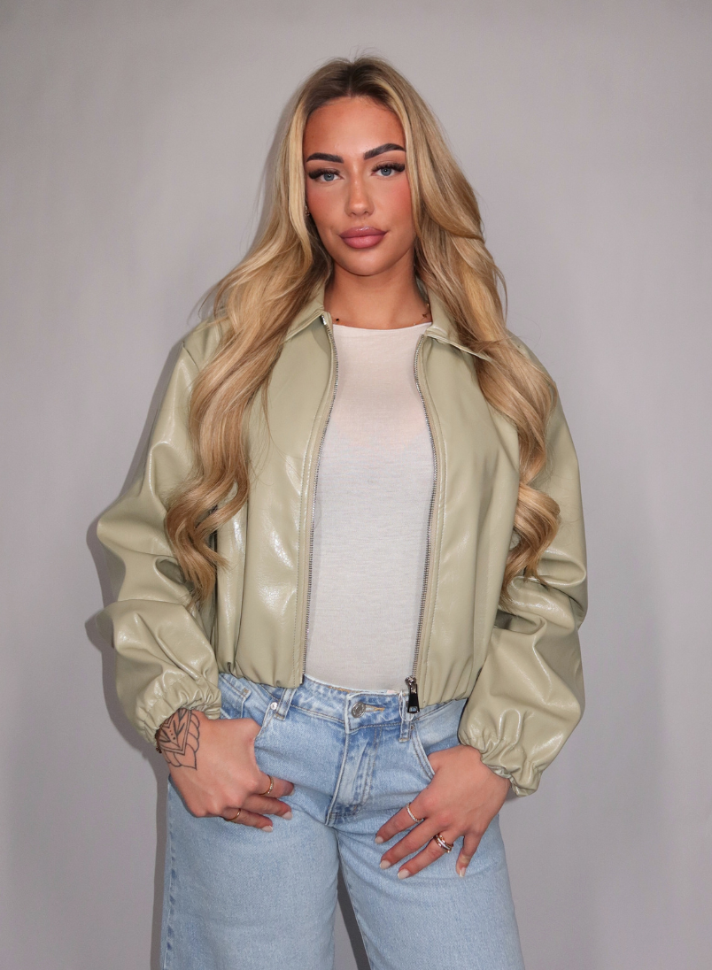 Het Inez jacket in sage green is een stoer en trendy jasje met een glanzende leather-look. Het model heeft een cropped pasvorm met een klassieke kraag en een ritssluiting aan de voorkant. De elastische band aan de onderzijde zorgt voor een licht blousend effect en een comfortabele fit. De glanzende stof geeft het jasje een opvallende en edgy uitstraling, perfect om een outfit net wat extra karakter te geven.