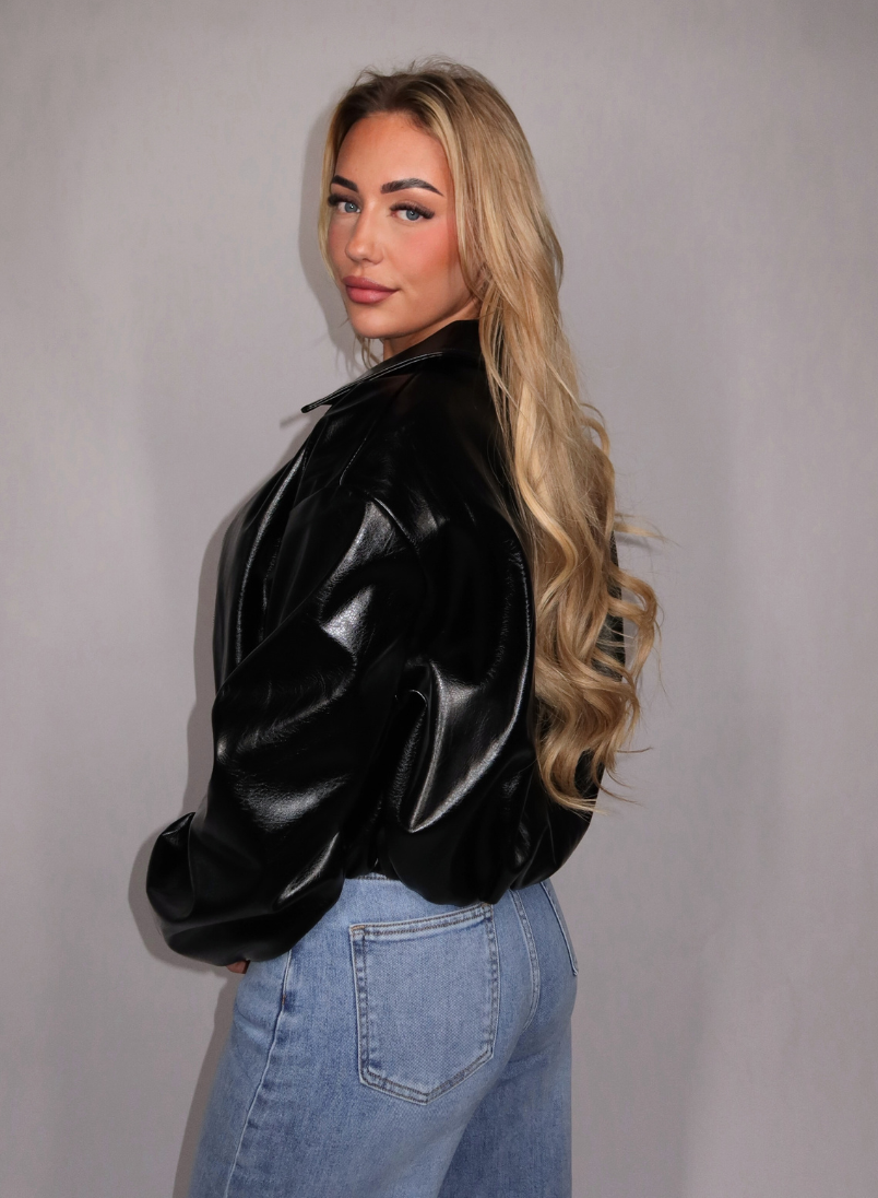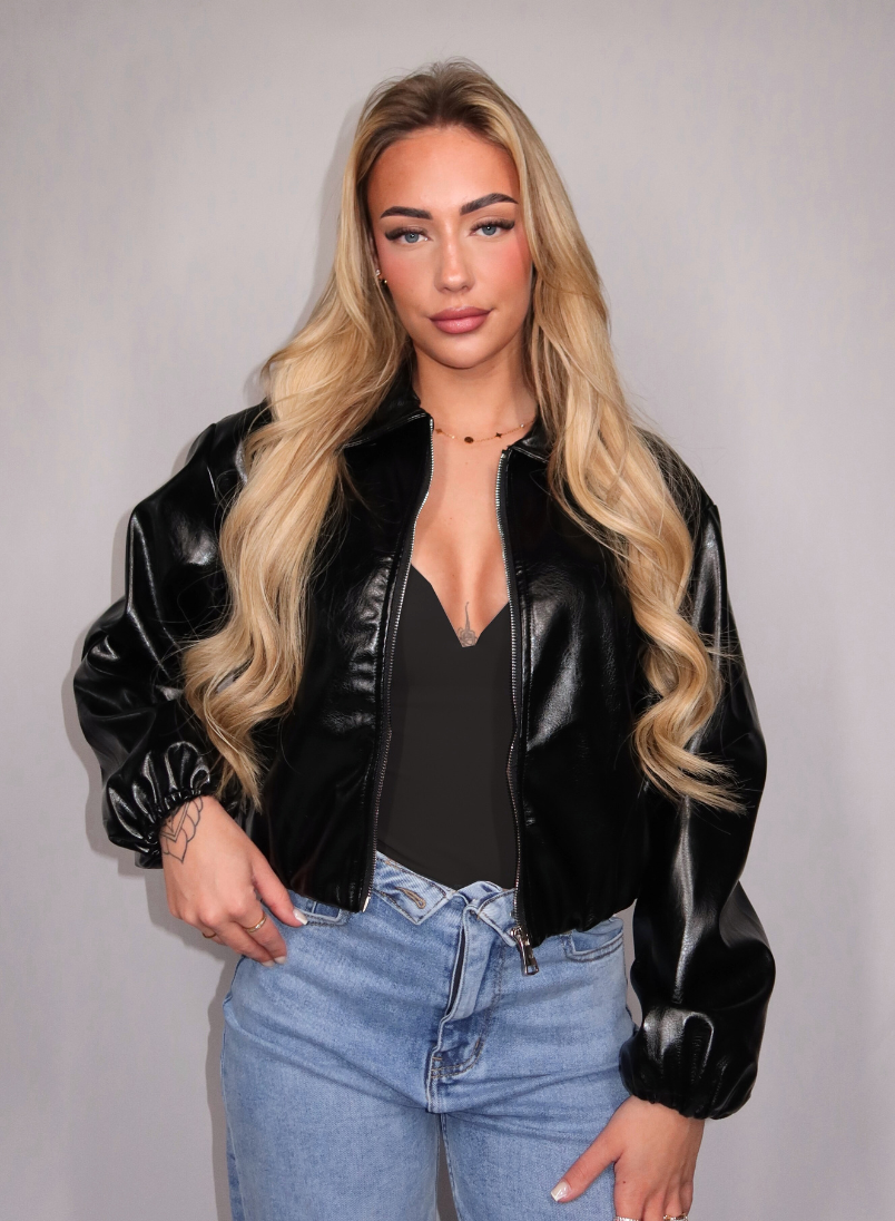 Het Inez jacket in zwart is een stoer en trendy jasje met een glanzende leather-look. Het model heeft een cropped pasvorm met een klassieke kraag en een ritssluiting aan de voorkant. De elastische band aan de onderzijde zorgt voor een licht blousend effect en een comfortabele fit. De glanzende stof geeft het jasje een opvallende en edgy uitstraling, perfect om een outfit net wat extra karakter te geven.