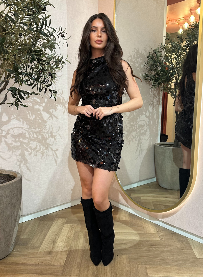 De Isabelle Dress is de ultieme party musthave voor het fall/winter seizoen. Deze zwarte mini-jurk is volledig bedekt met glinsterende pailletten en heeft een elegante hoge halslijn. De aansluitende pasvorm benadrukt je figuur prachtig en zorgt voor een stijlvolle, vrouwelijke look. Perfect voor feestjes, diners of de feestdagen – met de Isabelle Dress ben je gegarandeerd het stralende middelpunt van de avond. Combineer met laarzen of hakken voor een glamoureuze uitstraling.