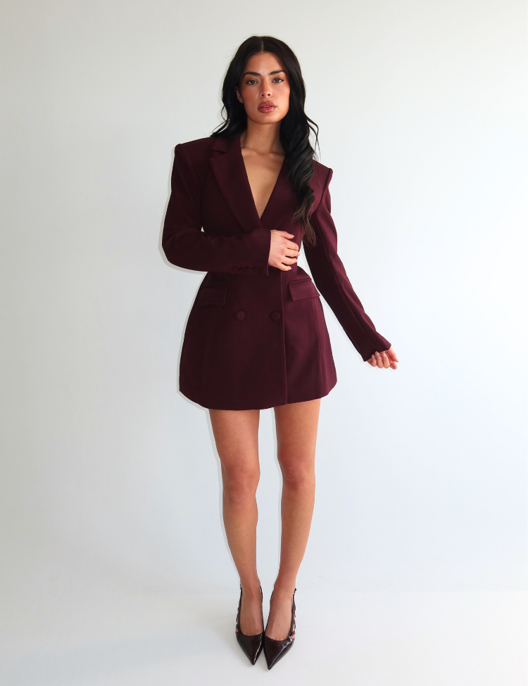 De Katie Dress – Burgundy is een krachtige en elegante blazer dress met een modern, vrouwelijk silhouet. De getailleerde pasvorm accentueert het lichaam op een verfijnde manier, terwijl de scherpe revers, dubbele knoopsluiting en subtiele schouderlijn zorgen voor een sterke, stijlvolle uitstraling. De diepe bordeauxkleur geeft de jurk een luxe en warme uitstraling en maakt het item perfect voor een verfijnde pre-spring garderobe.