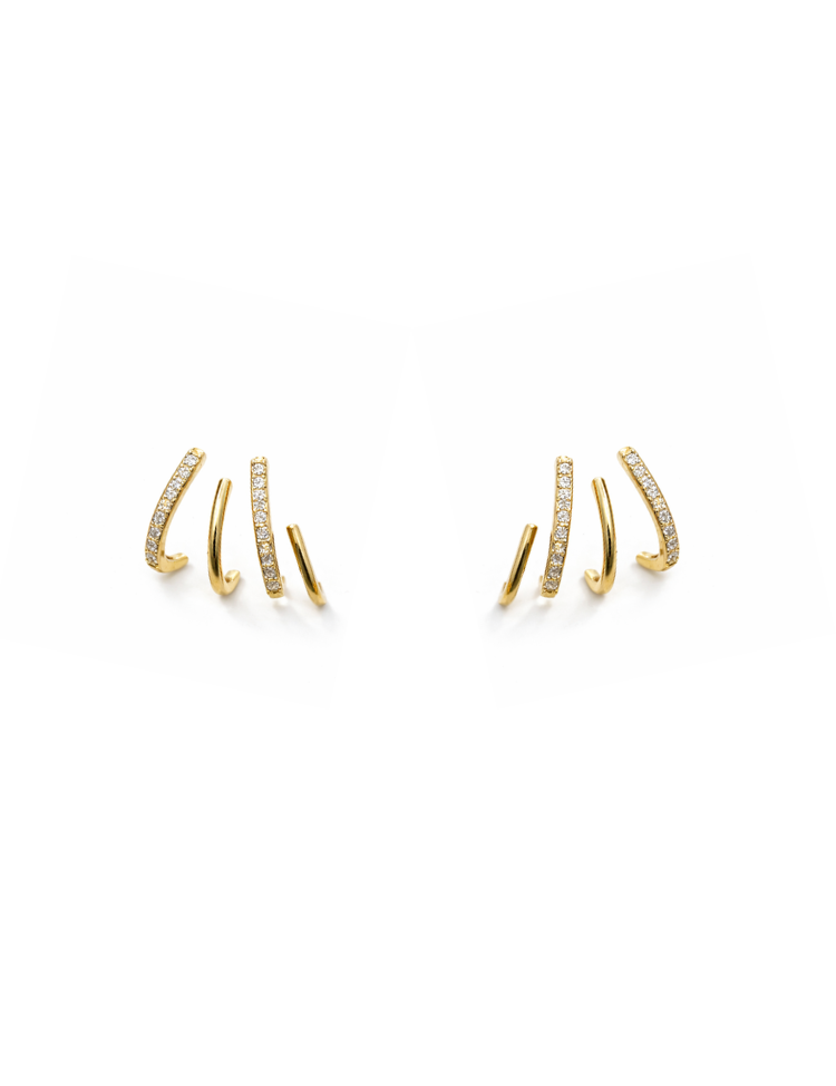 De Layered Hoops zijn verfijnde oorbellen met een speels gelaagd design dat de illusie geeft van meerdere hoops in één. Het model bestaat uit meerdere gebogen lijnen, waarvan één subtiel bezet is met kleine steentjes voor een lichte sparkle. De oorbellen hebben een elegante, aansluitende vorm langs het oor en zijn uitgevoerd in een goudkleurige finish, waardoor ze makkelijk te combineren zijn met zowel dagelijkse als feestelijke looks.