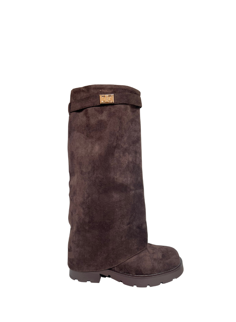 Statement boots met attitude, dat zijn de Mollie Boots. Deze edgy eyecatchers tillen elke look naar een hoger niveau dankzij hun oversized schacht met slouch effect en chunky profielzool. Het suede look materiaal zorgt voor een luxe uitstraling en voelt comfortabel aan tijdens het dragen. De stijlvolle, vierkante gesp aan de bovenzijde is een subtiele gouden touch die de boots een unieke high fashion vibe geeft.