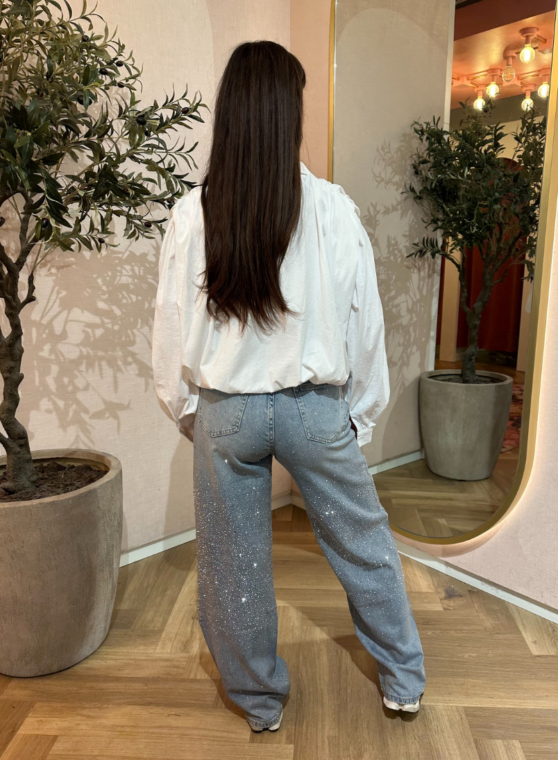 De Rina Jeans – Licht Blauw is een echte musthave voor jouw fall/winter garderobe! Deze wide leg jeans heeft een elegante lichtblauwe wassing en is versierd met subtiele sparkle details voor een vrouwelijke, glam touch. De hoge taille en rechte pijp creëren een flatterende pasvorm die zowel casual als chic te stylen is. Combineer met een blouse of knit voor een effortless fashionable look.