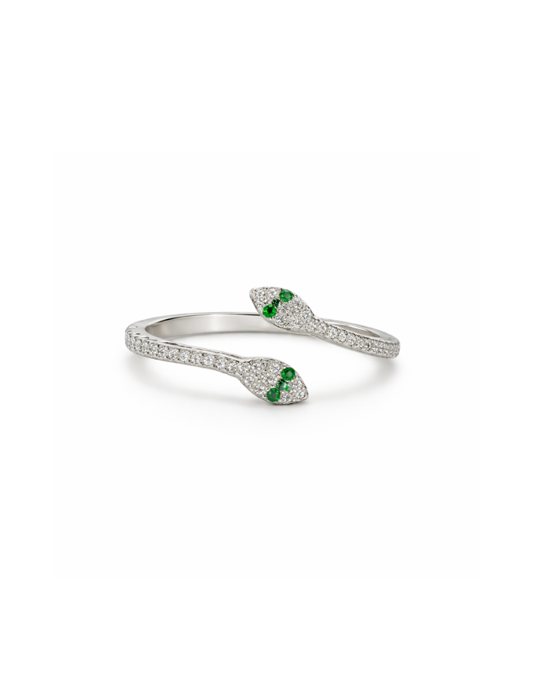 ing Snake in zilver heeft een opvallend, open design geïnspireerd op een sierlijke slangvorm. De ring wikkelt subtiel om de vinger en is volledig afgewerkt met kleine, glanzende steentjes. De uiteinden zijn vormgegeven als twee slangenkoppen met groene steentjes als ogen, wat zorgt voor een speels en uniek detail. Dankzij het open model is de ring licht verstelbaar en comfortabel te dragen. De zilverkleurige afwerking geeft het geheel een moderne en edgy uitstraling.