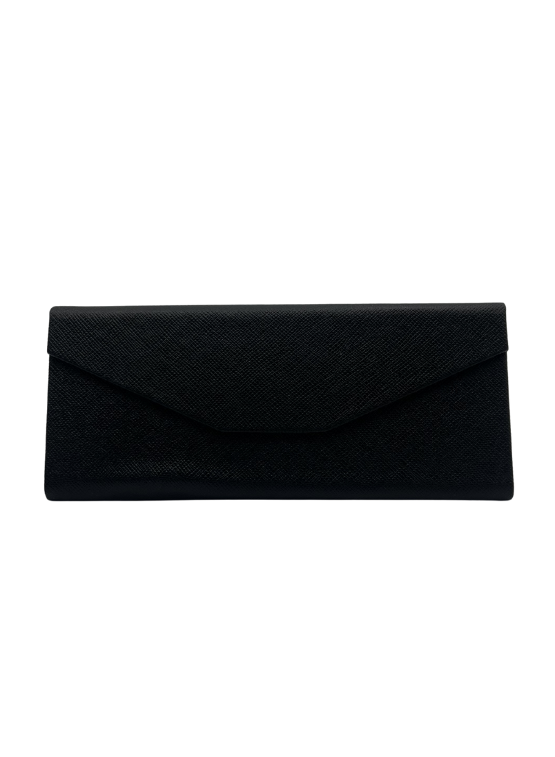 De Case Black zonnebrilhoes in zwart heeft een strak en minimalistisch design met een stevige, gevouwen vorm die optimale bescherming biedt. De hoes is gemaakt van een harde, gestructureerde stof met een subtiele textuur, wat zorgt voor een luxe uitstraling. Dankzij de flap sluiting blijft je zonnebril veilig opgeborgen en is de case ideaal om mee te nemen in je tas.